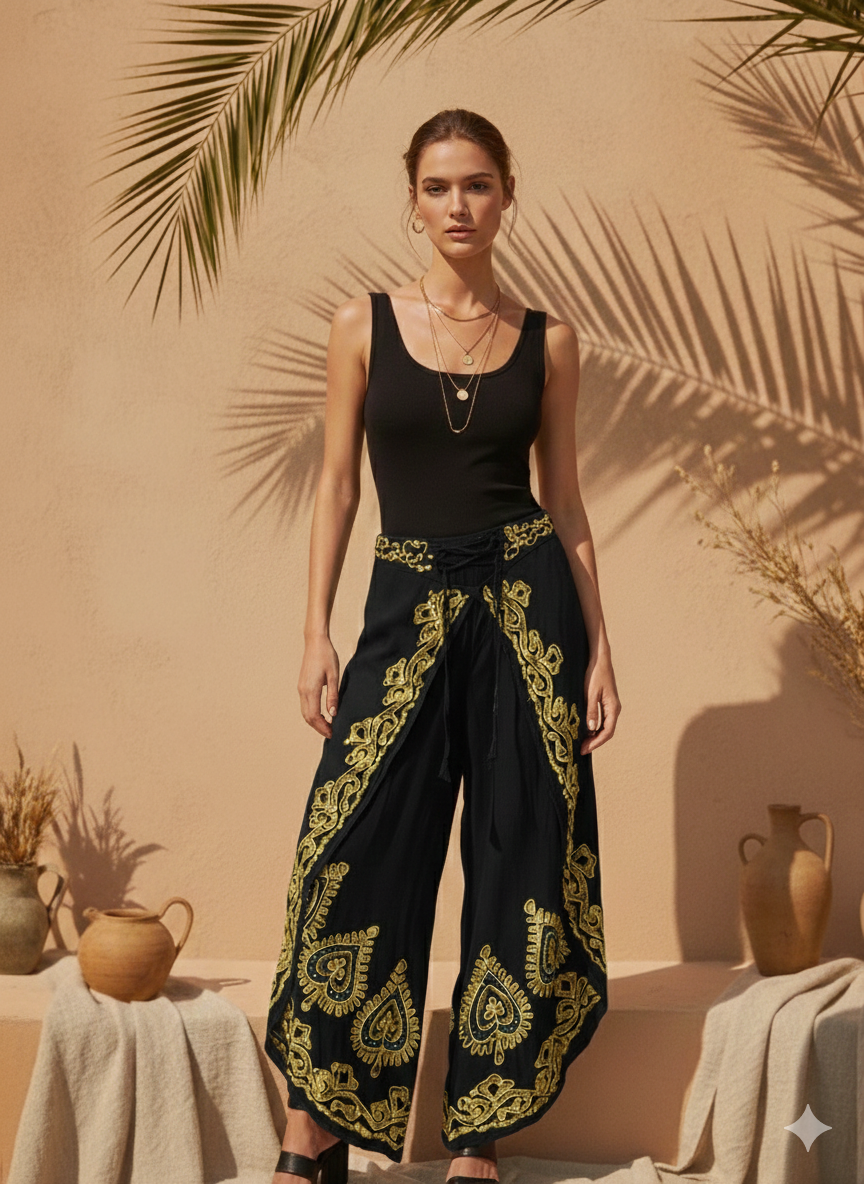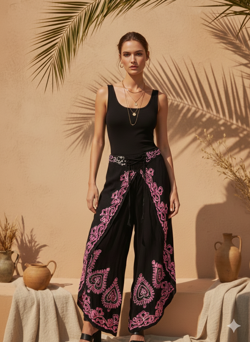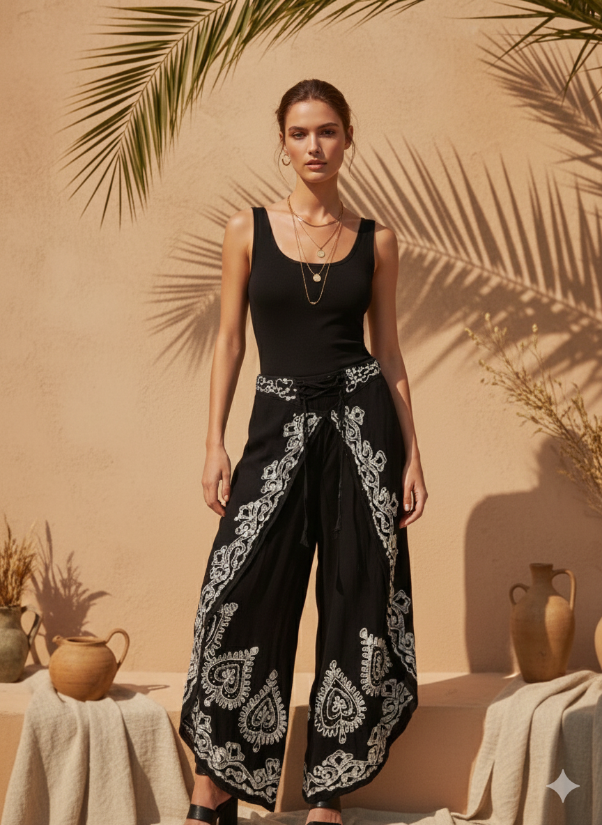 Ön kısmındaki kapaklı tasarım ve etnik işleme detayları, pantolona karakteristik ve otantik bir görünüm kazandırır. Günlük bohem kombinlerden tatil stiline kadar geniş bir kullanım alanına sahiptir. Büstiyer, crop top, bohem bluz ve sandaletlerle kolayca kombinlenir.