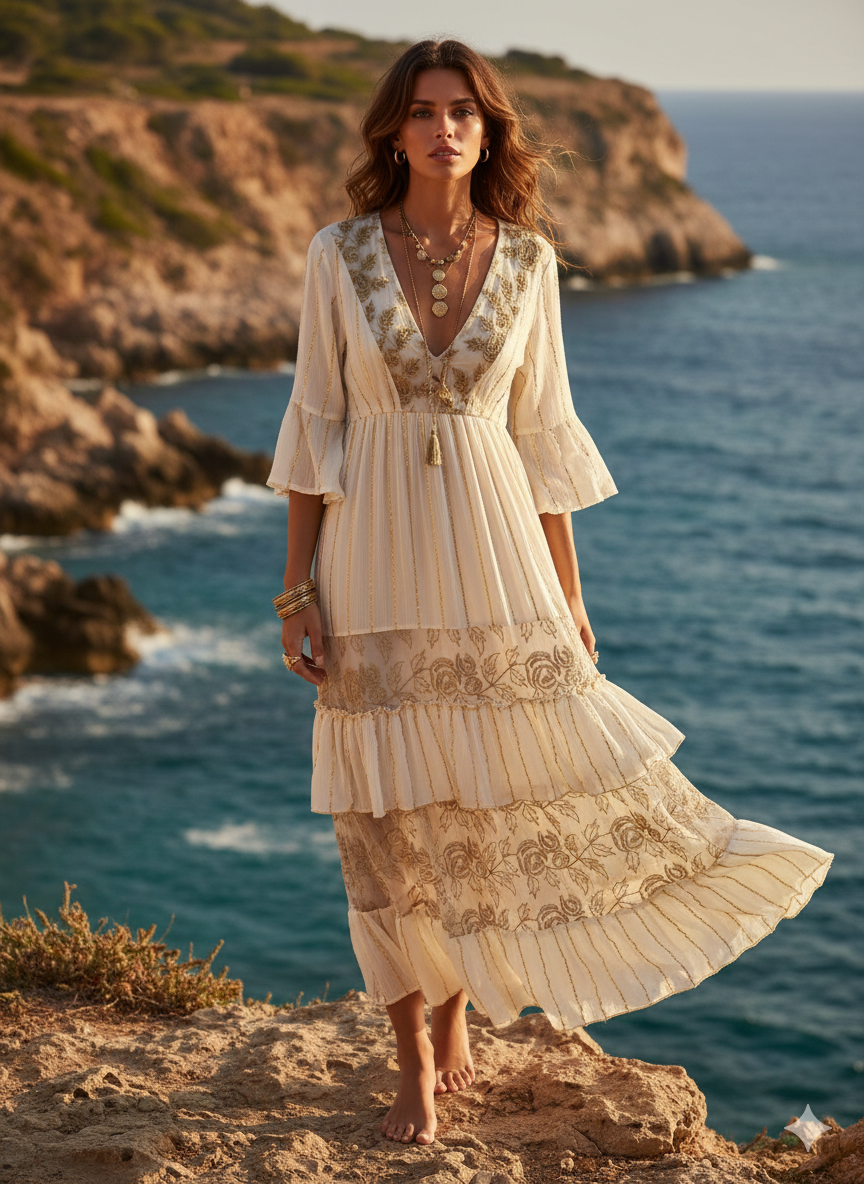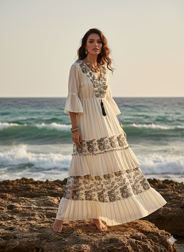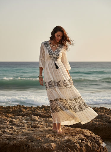 Hint menşei, ithal pamuk kumaştan üretilmiş; bohem tarzı yansıtan nakış detaylı özel tasarım elbise. Standart bedeniyle 38-46 aralığına uygundur.