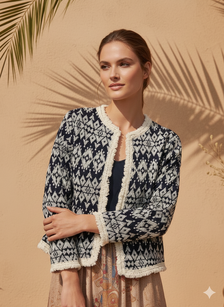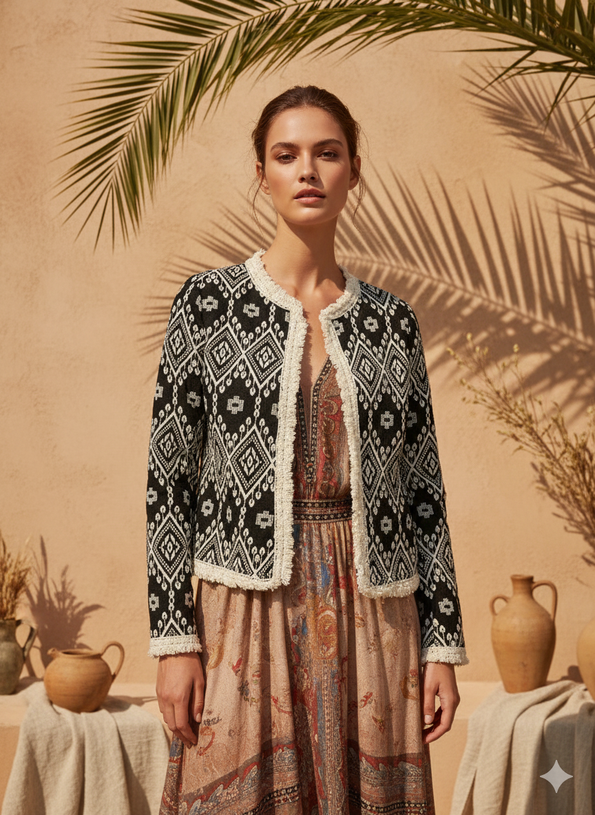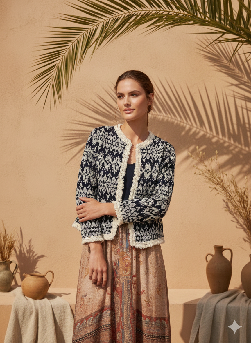 Doğal dokusu ve etnik desenleriyle öne çıkan ithal pamuk ceket, bohem ve otantik stilin tamamlayıcı parçalarından biridir. Hafif pamuk kumaşı sayesinde mevsim geçişlerinde ve serin yaz akşamlarında konforlu bir kullanım sunar.
